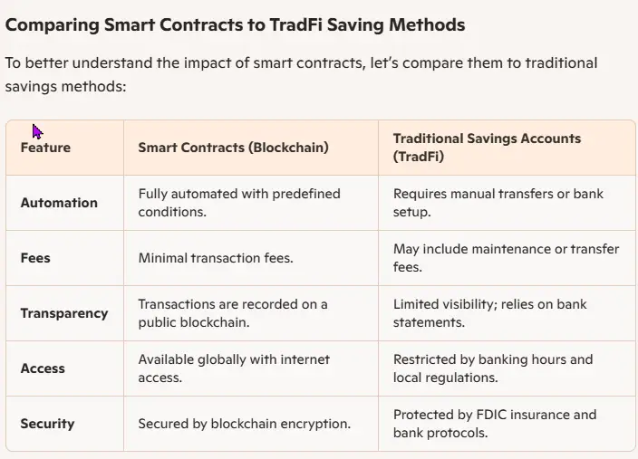 | Feature | Smart Contracts (Blockchain) | Traditional Savings Accounts (TradFi) |